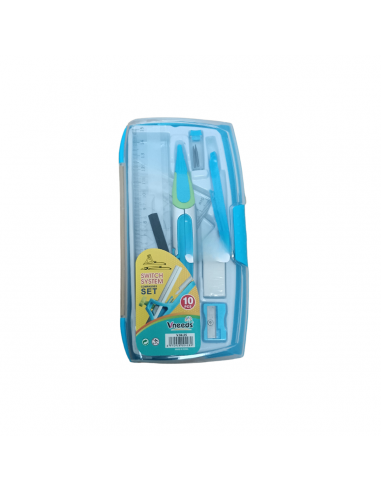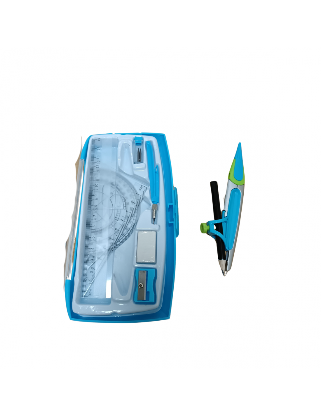 Sete de compas con juego de reglas, borra y minas, sacapuntas y lapiz